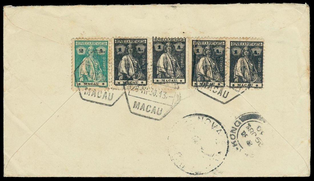 1930 (28 July) "Per s/s First Chance" envelope (with original enclosure) to Portuguese India (15.8) bearing on the reverse Ceres 1a. (4) and 2a. tied by hexagonal datestamp with Hong Kong and other transit c.d.s. Photo