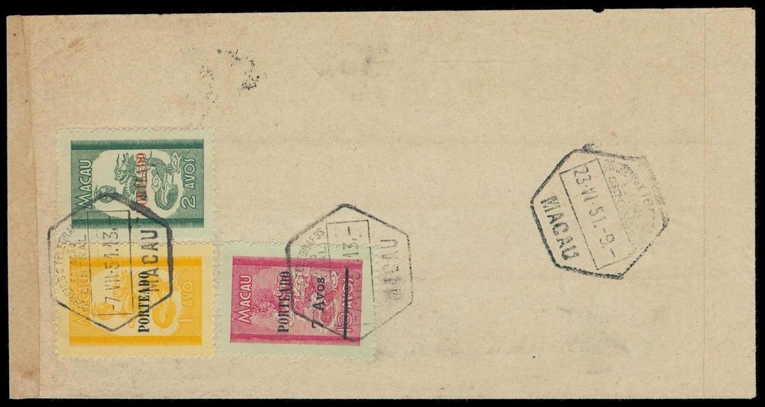 1951 (21 June) envelope from China bearing People's Republic $800 tied by Kwantung Province c.d.s., addressed to Macao with faint boxed handstamp in blue and, on the reverse, 1951 Postage Due set of three tied by Macau hexagonal datestamps (7.7); minor soiling in places. Photo