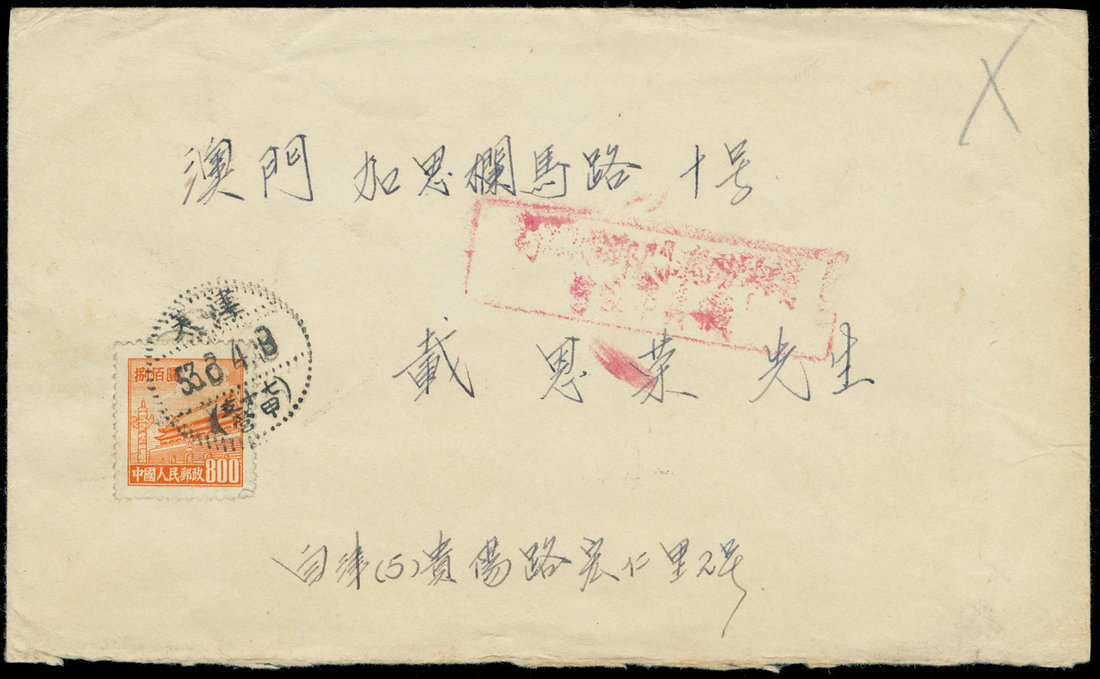 1953 (4 Jun.) envelope bearing Tien An Men $800 single, cancelled by "Tientsin" dotted rim d.s., on reverse with 1951 Postage Due overprinted on Dragon stamp 1a. (2) applied on arrival and cancelled by hexagonal d.s. (19.6). Photo