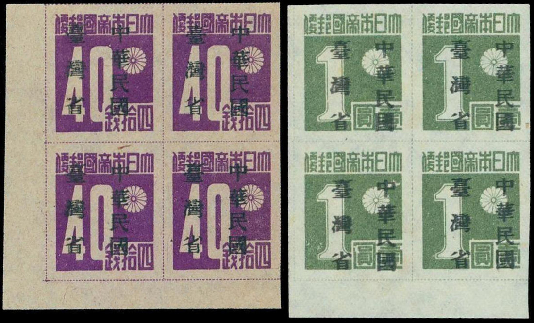 1945 overprinted "Republic of China, Taiwan Province" 3s. to 10y. set of nine in corner marginal blocks of four, both 40s. and 1y. with additional blocks showing part doubling ("kiss" print) of the Chinese characters on a few stamps fine to very fine unused. Chan TP4-TP12. Photo