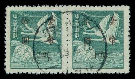 1950 (5 Jan.) Flying Geese $10 on (-) blue-green horizontal pair, centrally cancelled by "Taipeh" bilingual c.d.s. Scott 1010. Photo