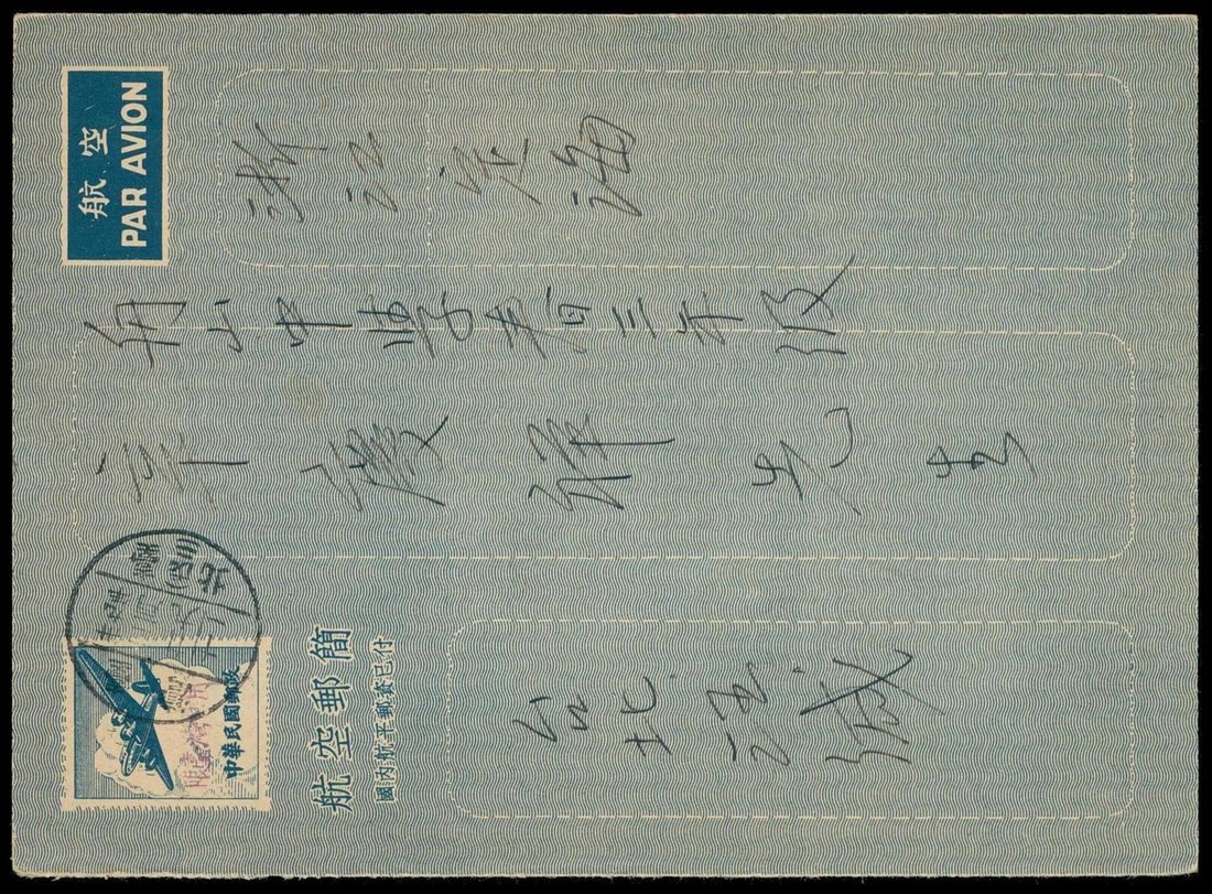 1950 (29 Dec.) unit aerogramme with "Limited For Use in Taiwan Province" overprints to Ting Hai, Chekinag, cancelled by "Taipei" c.d.s., fine. Photo
