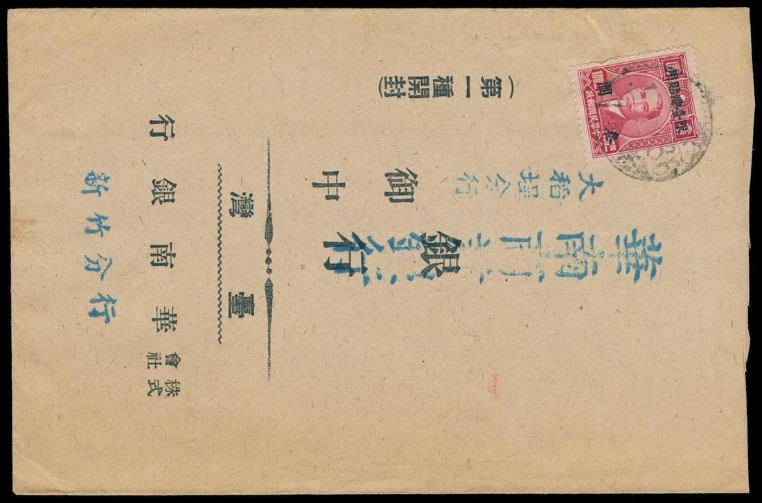 1947(c.) envelope used locally in Taiwan bearing "Limited for Use in Taiwan" overprints $3 on $100 Dr. Sun Yat-sen 1st Shanghai Dah Tung print, cancelled by "Sinchu" c.d.s. and showing "Dadaocheng" arrival on reverse. Photo
