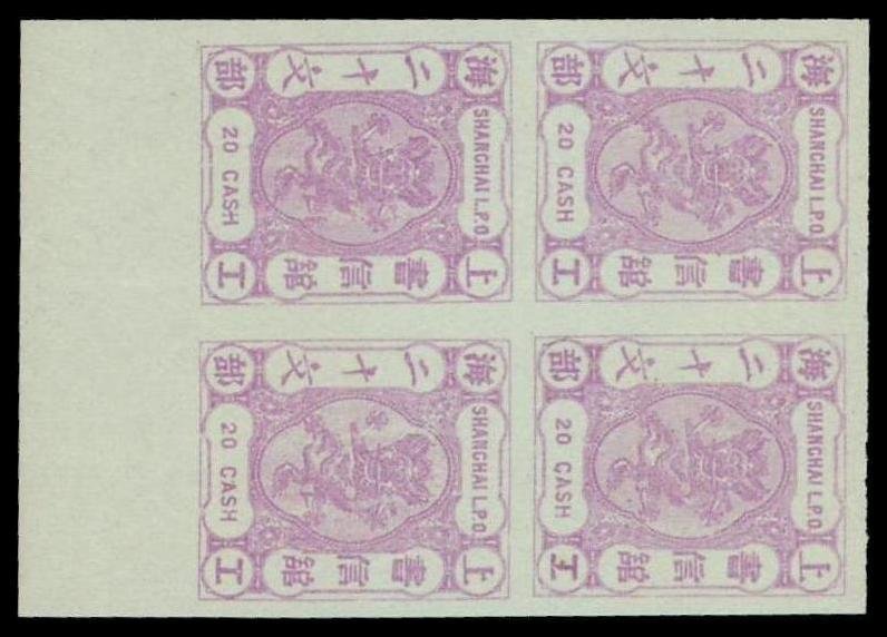 1877-80 20 cash lilac in a lower margin imperf. plate proof block of four, without gum as usual, fresh and fine. Chan LS82P. Photo