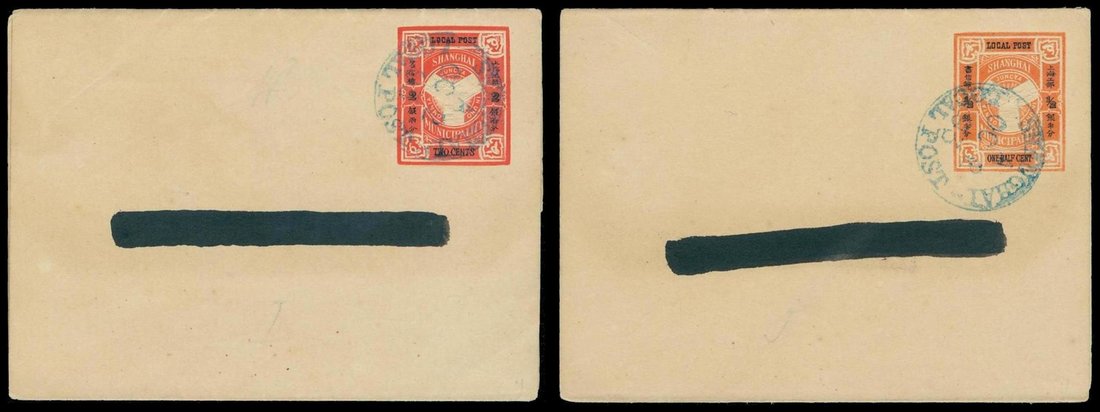 1893 (2 Oct.) Coat of Arms ½c. and 1c. stationery wrappers, cancelled by "Shanghai/Local Post" index "A" c.d.s. Photo