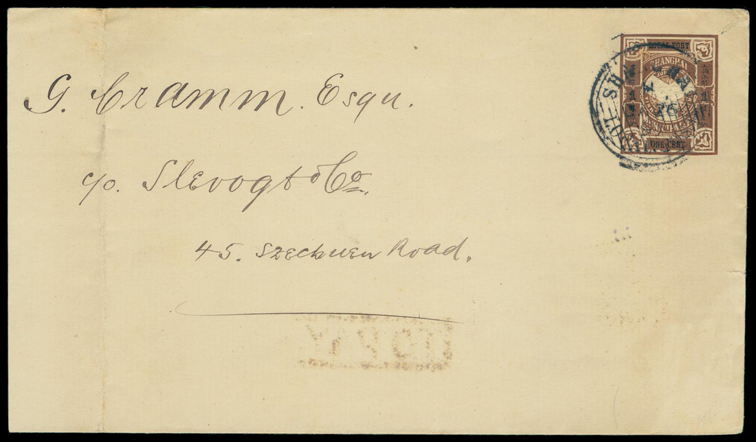1897 (25 Jan.) Barclay & Fry 1c. stationery envelope used locally, with indicia cancelled by "Shanghai/Local Post/H" double-ring d.s. Photo