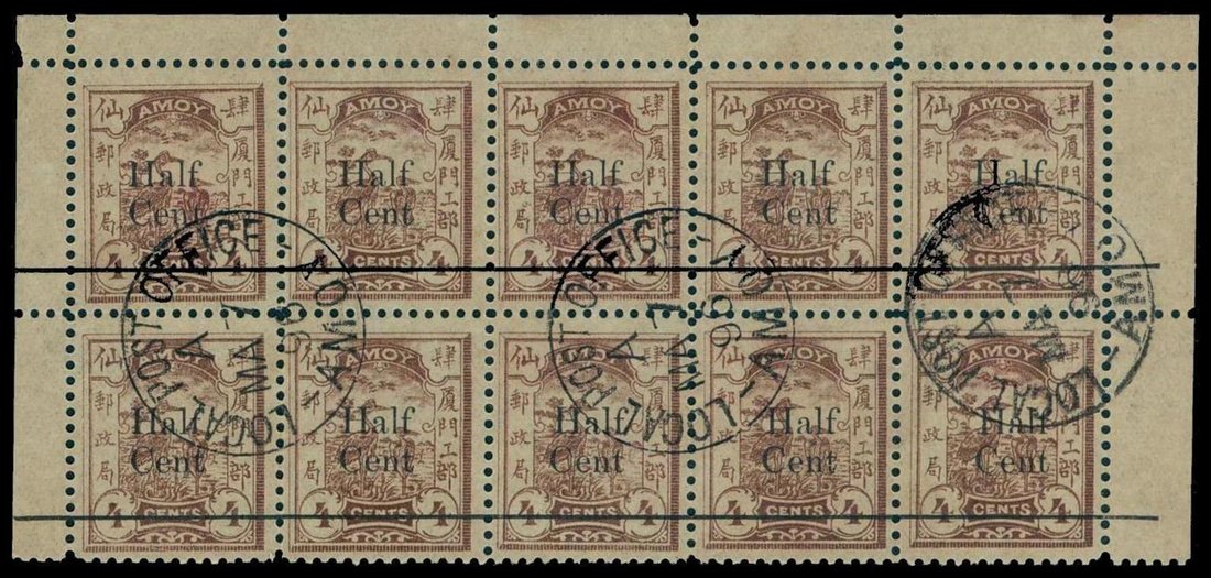 1896 "Half Cent" (Wide "f") surch. on Herons issue 4c. reddish brown, in corner block of ten (5x2, top two rows), fine cancelled by three complete strikes of "Local Post Office/Amoy" index "A" c.d.s. of "Ma 7 96". Chan LA7. Photo