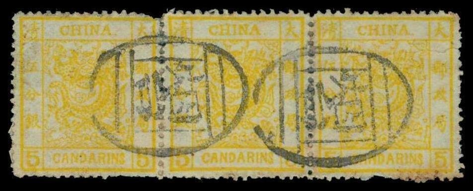5ca. chrome-yellow, clean-cut perfs., horizontal strip of three, cancelled by two complete strikes of Chefoo seal, well centred, very fine and fresh. Chan 9. Photo