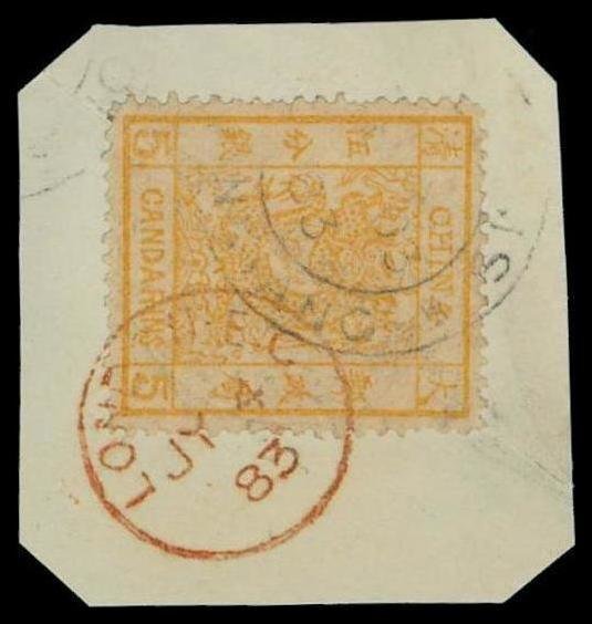 5ca. chrome yellow (clear-cut perfs.) on pieces, cancelled by "Customs/Chinkiang" double-ring d.s. of 1883 and "London" c.d.s. of "JY 4 1883", unusal. Chan 9. Photo