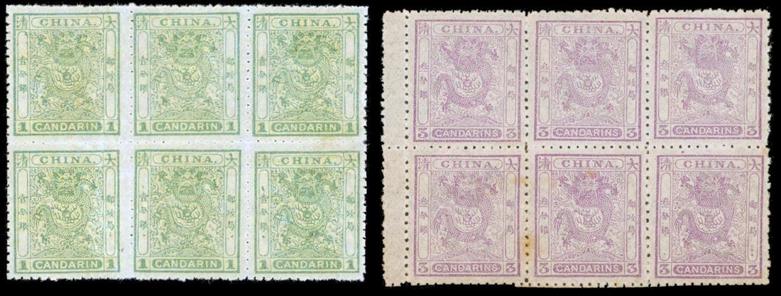 1ca.bright green and 3ca. mauve clean-cut perfs., in blocks of six (3x2), the 3ca. block also with margins, very fine and fresh unmounted mint, very good and scarce in large multiples. Chan 13, 14. Photo