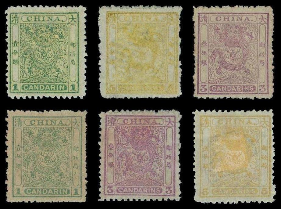 1ca. to 5ca. set of three, two sets in different shades, part to large part original gum; one 5ca. with paper adherence on the reverse. Photo