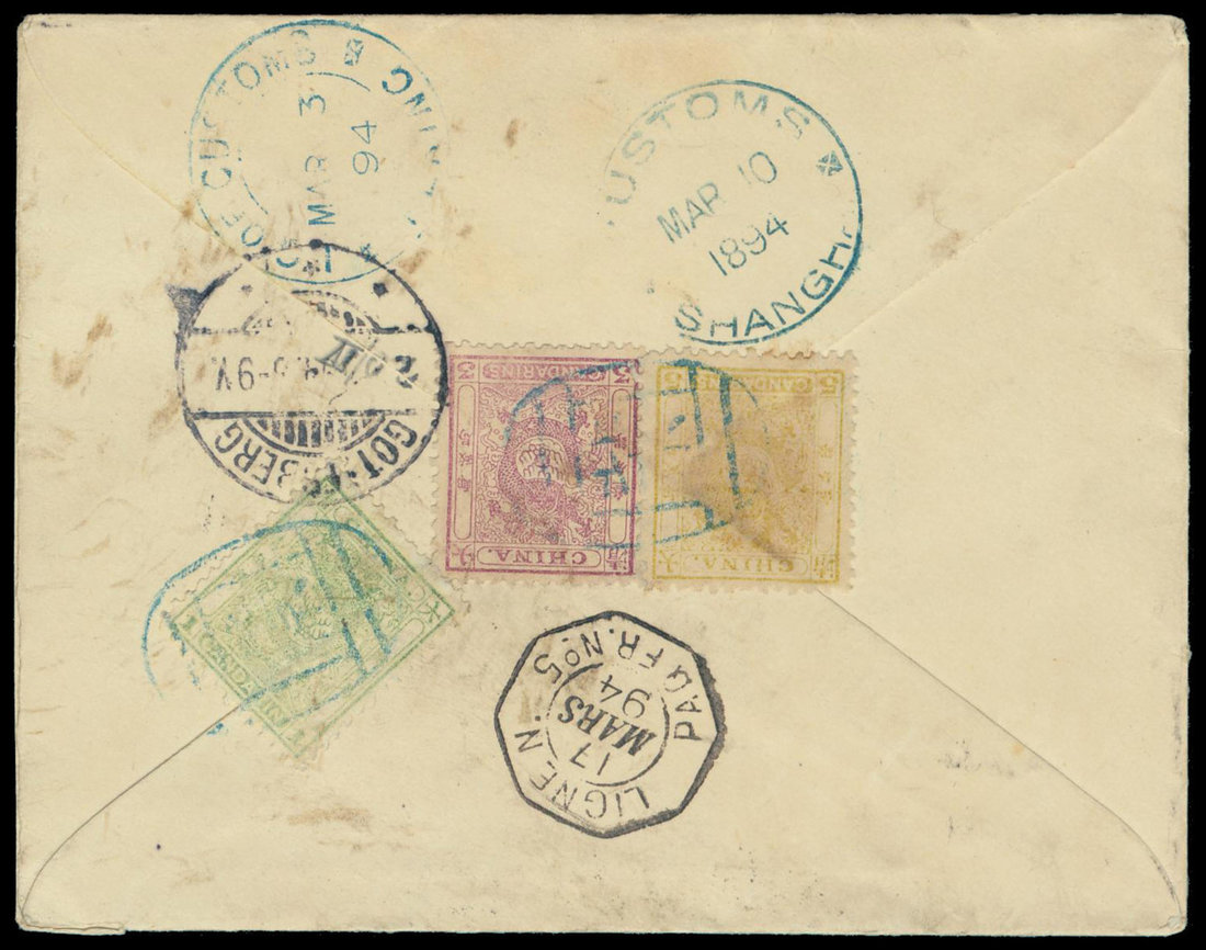 1894 (3 Mar.) envelope addressed toGermany bearing France 25c. tied by "Shang-hai/Chine" c.d.s. (12.) and bearing, on the reverse, Small Dragon 1ca., 3ca. and 5ca. cancelled by fair to good strikes of "Peking" seal in blue, with matching "I.G, of Customs/Peking c.d.s. in blue, showing alongside "Customs/Shanghai" c.d.s (10.3), and "Ligne N/Paq. Fr. No. 5" octagonal d.s. (17.3). An attractive cover. Photo