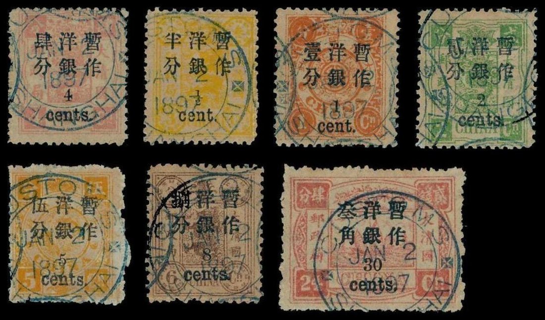 ½c. on 3ca. to 8c. on 6ca. and 30c. on 24ca., each centrally cancelled by "Customs/Shanghai" double-ring d.s. of "Jan 2 1897" in blue, the official day of issue, fine and fresh, a nice set. Chan 37-42, 46. Photo