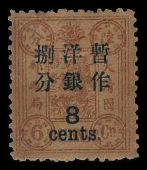 8c. on 6ca. chocolate, unused with large part original gum, hinged, uniform toning, nevertheless a fine example of this popular stamp. Chan 52. Photo