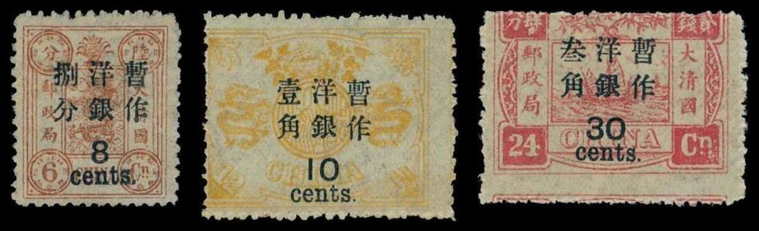 ½c. on 3ca. to 30c. on 24ca. setv of nine, good colours, fine unused with much original gum, the 10c. on 12ca. and the 30c. on 24ca.bear miscut varieties resulting the stamp design slightly missing, but also showing the outer frame lines of the adjacent stamps. Chan 56-64. Photo