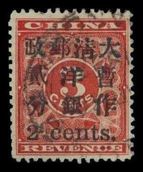 2c. on 3c. red, showing smaller central Chinese characters "Yang" and "Yin" in middle column, fine cancelled by c.d.s., Chan 84b. Photo