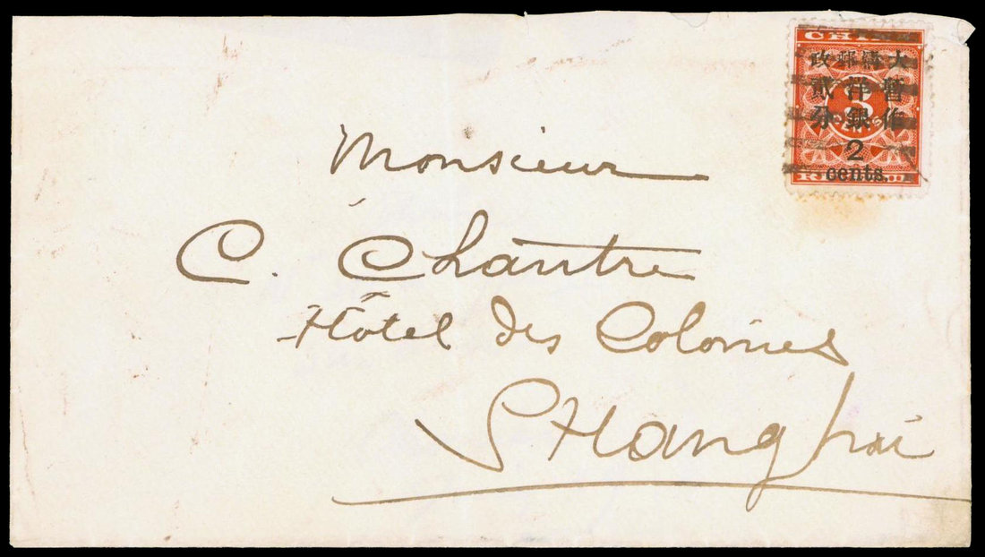 2c. on 3c., cancelled by Chefoo pakua, matching "Customs/Chefoo" origin c.d.s. on reverse, also with "Customs/Shanghai" arrival c.d.s.,very fine. With 2013 certificate. Photo