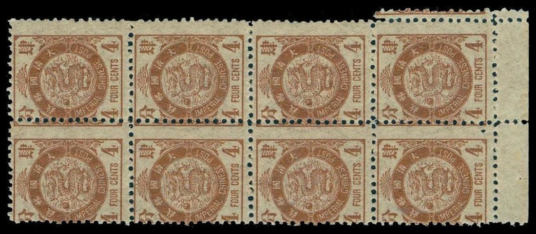 4c. orange-brown in a lower margin block of eight (2x4), with full original gum; perforations centred well to the right, a few split perf.and light gum ageing. A good multiple. Chan 95. Photo