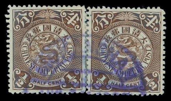 ½c. maroon horizontal pair, cancelled by half strike of the large "Moganshan" non-standard c.d.s. in violet, very fine. Chan 116. Photo