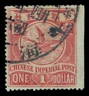 $1 red and pale rose, variety imperf. at right, fine cancelled by "Shanghai" dollar dater. Chan 126var. Photo