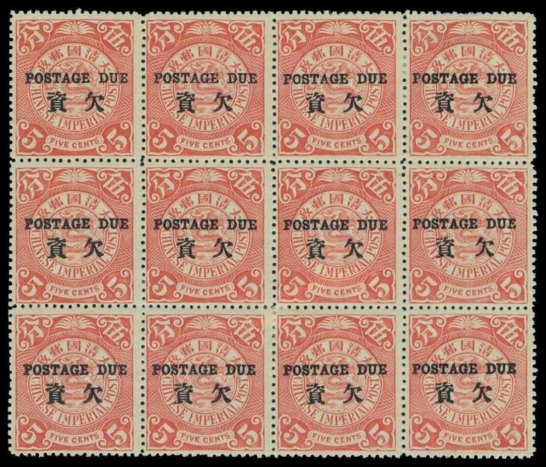 1904 C.I.P. overprinted "Postage Due" 5c. blocks of twelve, very fine unused with original gum, paper adherence on reverse. Chan D5. Photo