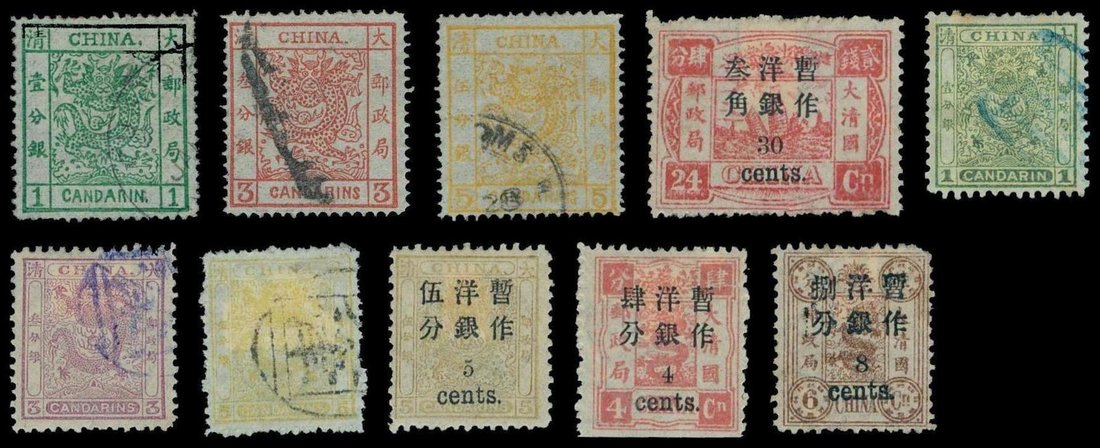 A small selection which includes Large Dragon 1ca., 3ca. and 5ca., two with part Customs c.d.s. and one with part Newchwang seal, Small Dragons set used, 1897 Small Figures part original gum 4c. on 4ca. (variety extra long stroke of four) , 8c. on 8ca. and 30c. on 24ca, 5c. on Small Dragon; some Local Posts including Shanghai 2ca. Large Dragon and a few others, (24). Photo