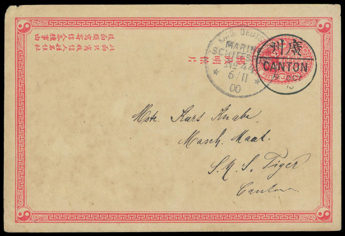 1900 (9 Oct.) I.C.P. 1c. stationery card with handpainted illustration on reverse, with the indicia cancelled by "Canton" bilingual c.d.s.and German P.O. c.d.s. (6.11). Photo