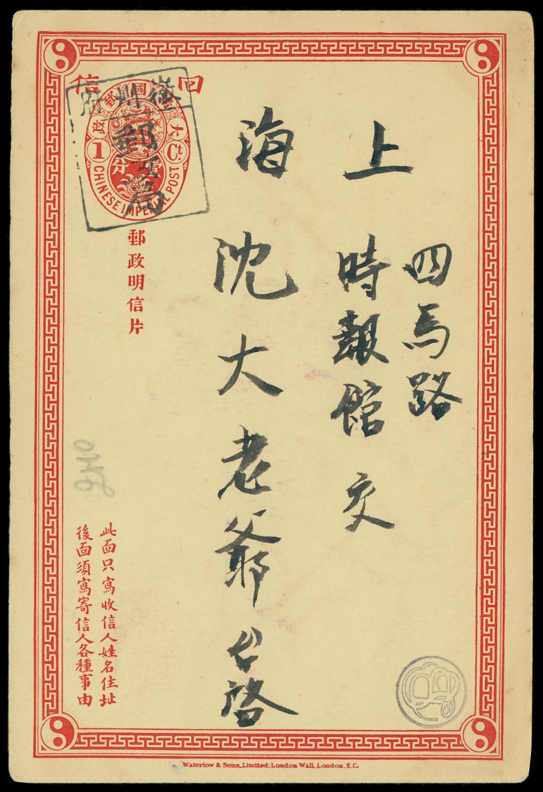 C.I.P. 1c. reply card (message portion) with handpainted illustration on reverse showing butterfly and flowers to Shanghai, with indicia cancelled by "Huichowfu/Post Office" tombstone. d.s., very fine. Photo