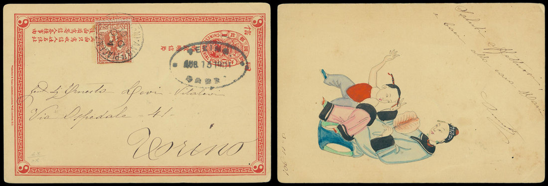 1901 (13 Aug.) C.I.P. 1c. reply card (message portion) to Italy (4.12), with the indicia cancelled by "Peking" oval d.s., Italy 2c. red brown applied on arrival and cancelled by c.d.s., fine and unusual. Photo
