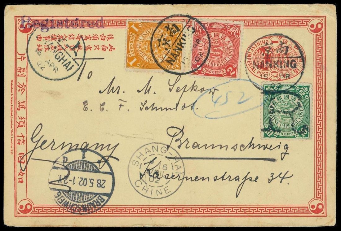 1902 (15 Apr.) C.I.P. 1c. stationery card registered to Germany (28.5), bearing C.I.P. 1c., 2c. and 10c., cancelled by "Nanking" bilingual c.d.s. with the 10c. additionally cancelled by unframed "R" h.s., fine. Photo