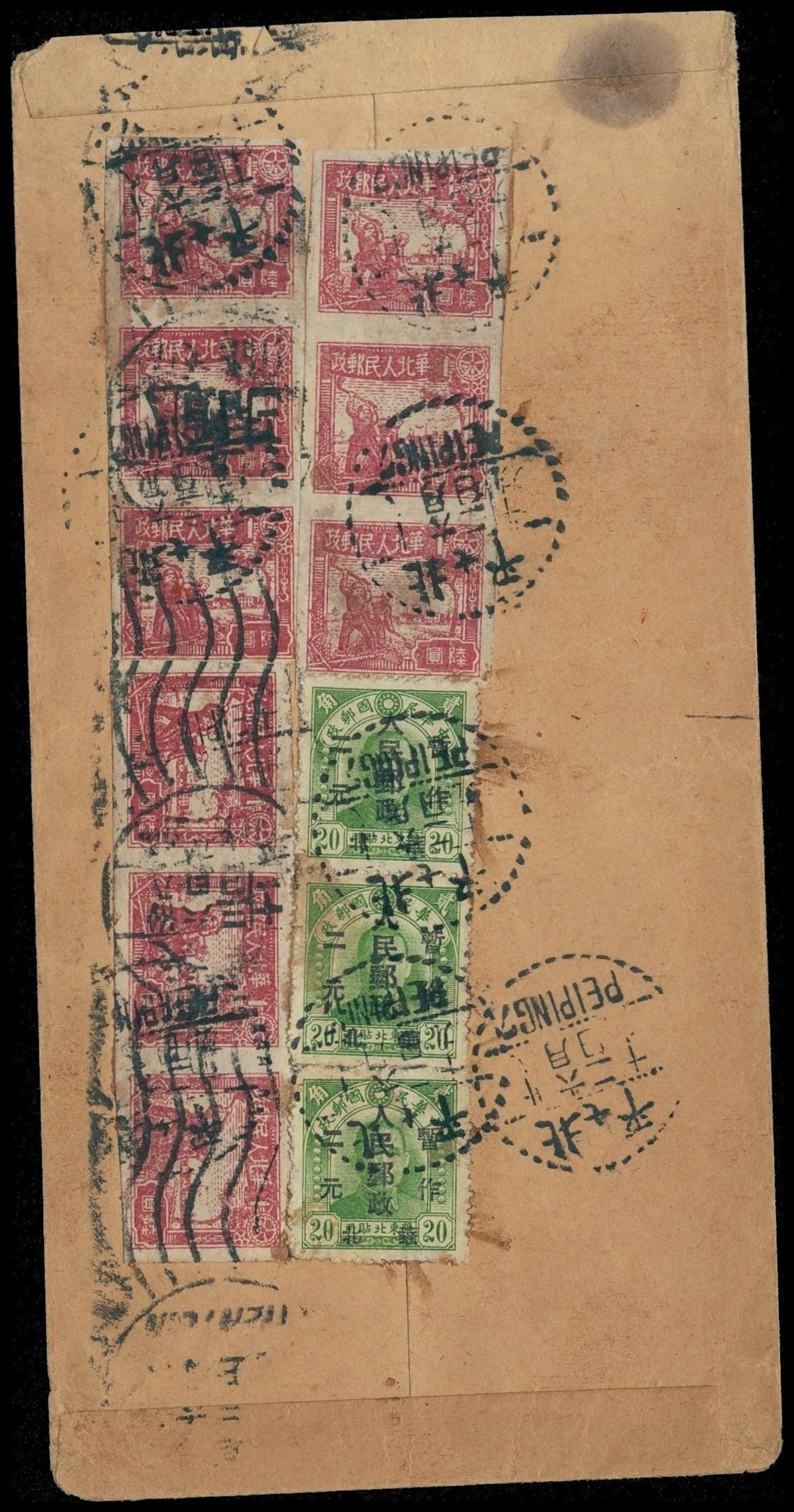 1949 (2 June) envelope from Peiping to Tientsin, on reverse franked with Shih Kia Chang $6 pale claret (9) and Peking surcharged $2 on 20c yellow green in pair, tied by bilingual "Peiping" dotted rim d.s,. bilingual "Tientsin" roller machine cancellation on Shih Kia Chang issues. Photo
