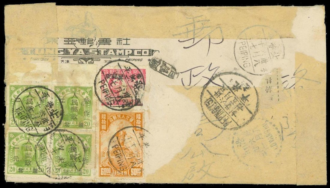 1949 (17 June) envelope registered locally in Peiping, franked with Hotswch surcharged 'North China People's Post' on Chairman Mao, Pingshan print $12 on $200 violet red, Peking surcharged on SYS 'Limited For Use In Northeast' $2 on 20c yellow green block of four, and International Labour Day $60 yellow brown, tied by bilingual "Peiping" c.d.s, This envelope had been reused, and thus another bilingual "Loyang" dotted rim d.s. had been shown as diffused from the bottom. Photo