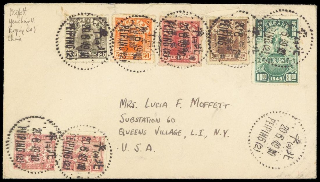 1949 (20 June) envelope from Peiping to U.S.A.,bearing Shih Kia Chang 50c purple in pair, Peking surcharged on SYS 50c. on 5c. lake, $1 on 25c. black brown, $3on 50c. orange, $18 on $3 brown, and International Labour Day $80 blue green, tied by bilingual "Peiping (2)"' c.d.s. Photo