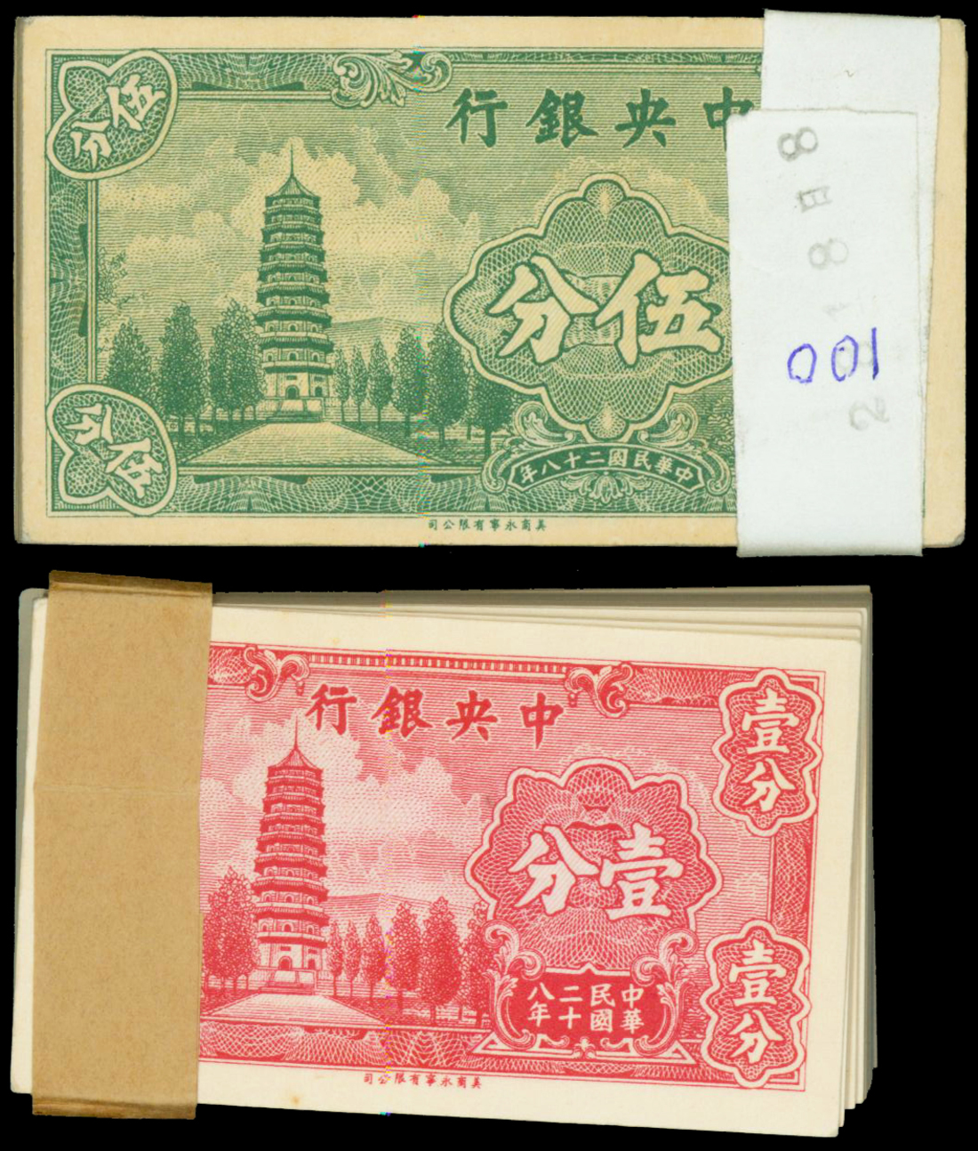 Central Bank of China, consecutive run of 100 x 1 cent and 5 cents, 1939, serial number E403201B to E403300B, D328101A to D328200A, red and green respectively, pagoda at left,