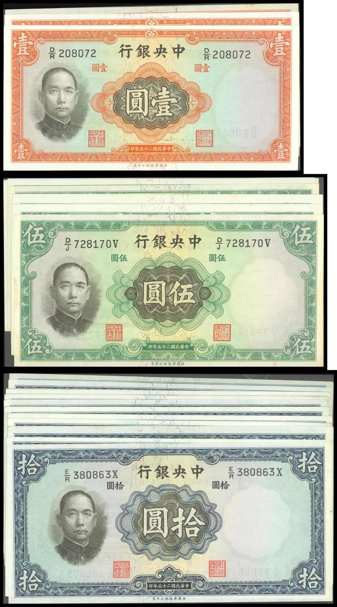 Central Bank of China, lot of 39 notes, 1yuan (4), 5yuan (10), 10yuan (25), all dated 1936, (Pick 212, 214 and 218), almost uncirculated to uncirculated (39).
