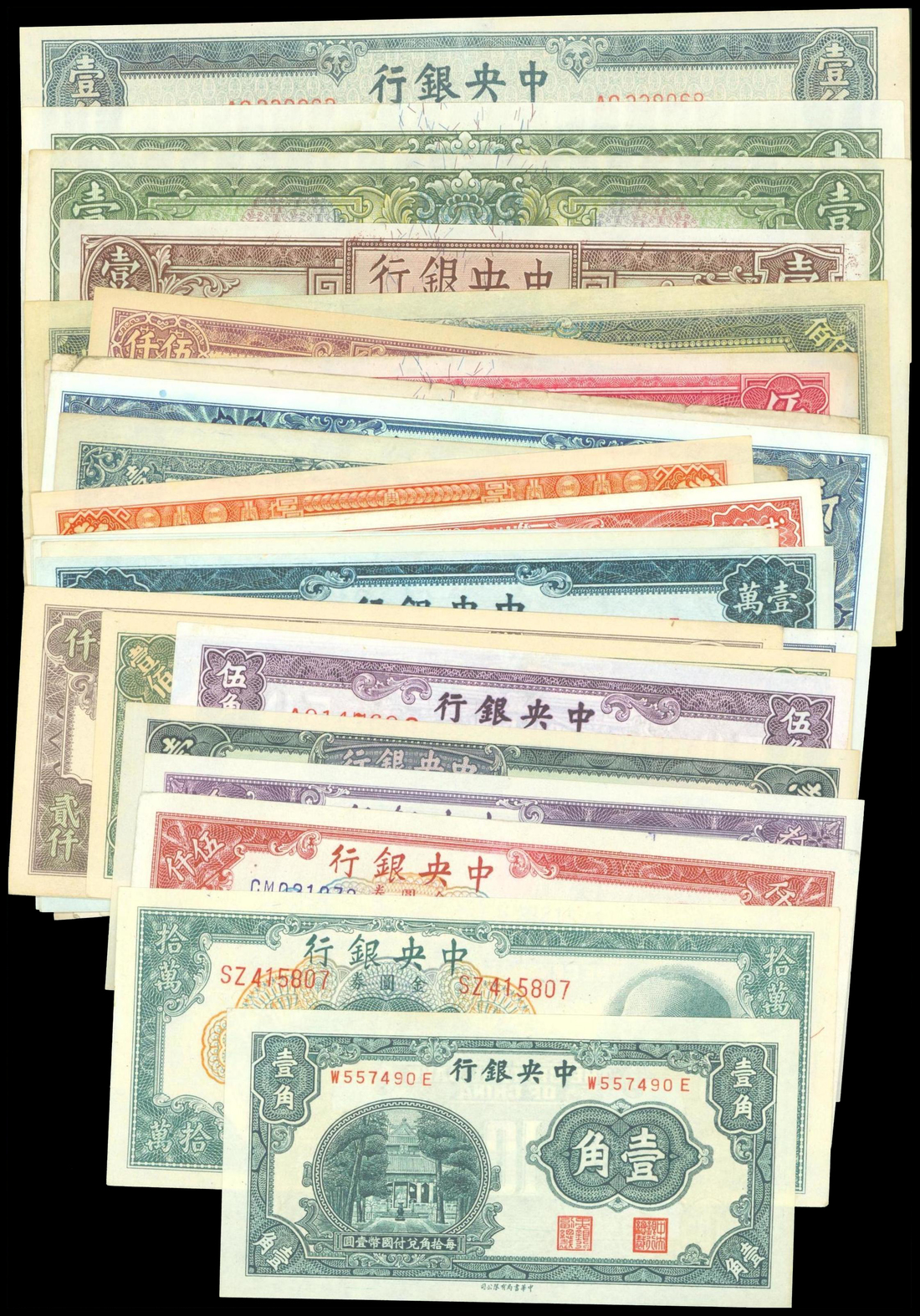 Central Bank of China, lot of 31 banknotes, mostly from the mid 1930's to 1940's, many different denominations, most notes in extremely fine to uncirculated condition, sold as is, no returns (31).