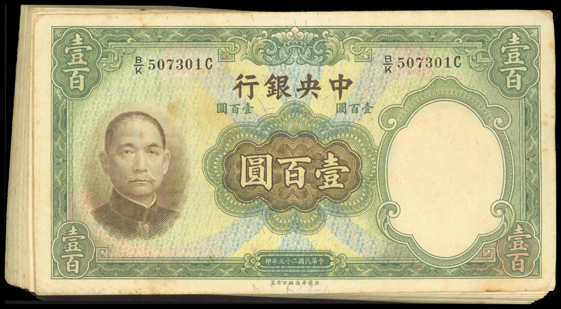 Central Bank of China, 100 yuan, 1936, consecutive run of 100, serial number BK507301C to B/K507400C, olive-green on multicolour underprint, Sun Yat Sen at left, reverse violet, Palace at centre,