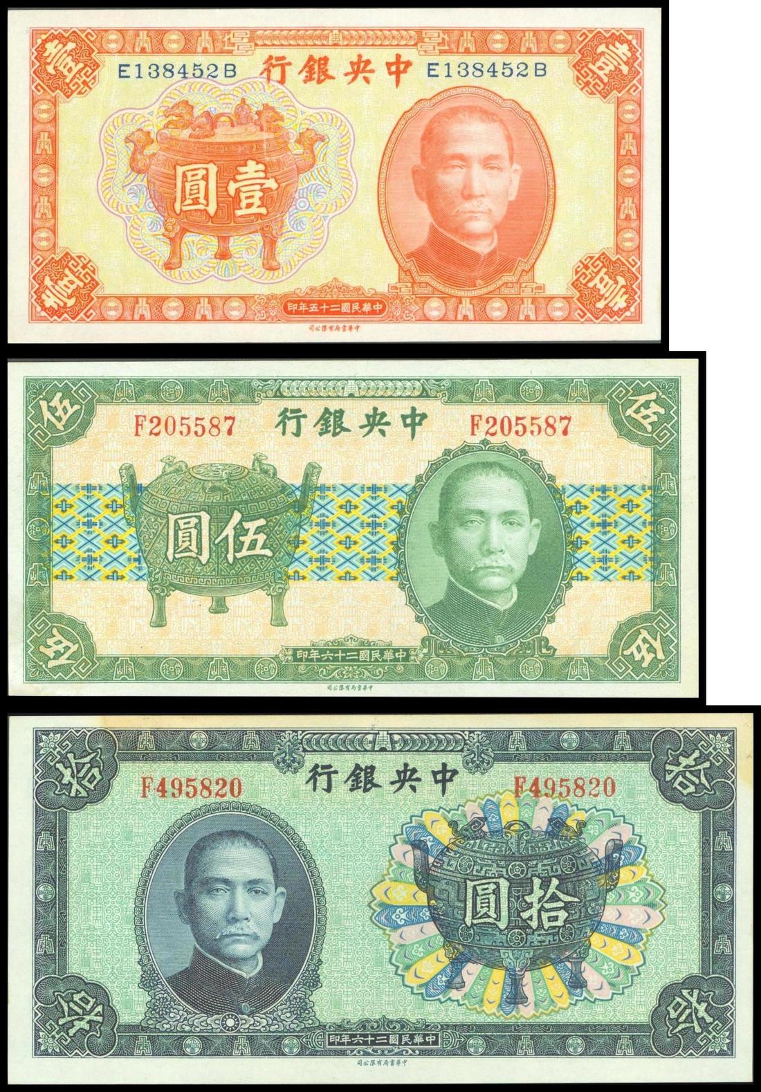 Central Bank of China, set of 3 notes from the 'Treasure Pot' series, 1936-37, consisting of 1yuan, 5yuan and 10yuan, similar designs depicting Sun Yat Sen and an ancient bronze three legged vessel,