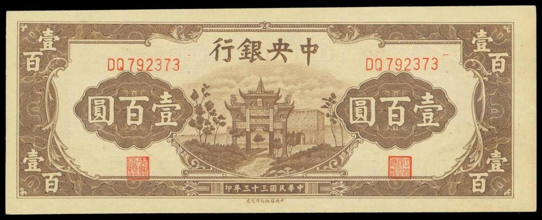 Central Bank of China, 100 Yuan, 1944, serial number DQ792373, brown, pai-lou gateway at centre, value and red seals left and right, reverse brown,