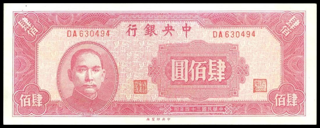 Central Bank of China, 400yuan, 1945, red-purple, Sun Yat Sen at left, plain red reverse,