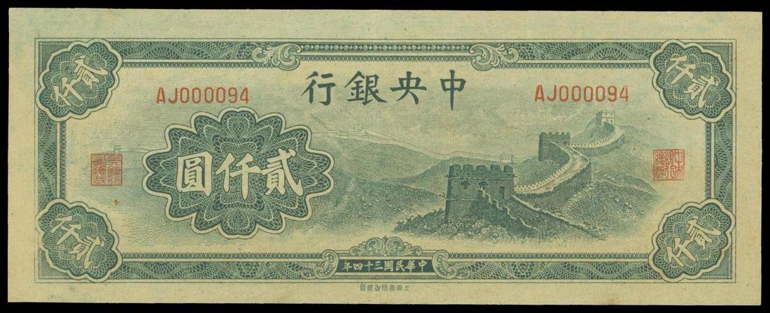 Central Bank of China, 2000 Yuan, 1945, a very low serial number AJ000094, green, Great Wall at right, value at left, reverse brown,