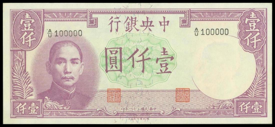 Central Bank of China, 1000 yuan, 1942, 'Lucky' serial number A/U 100000, violet and light green, Sun Yat Sen at left, reverse violet, Great Wall at centre,