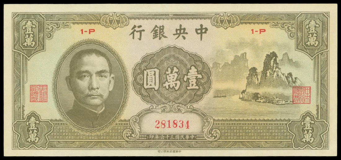 Central Bank of China, 10000 yuan, 1947, serial number 281834, olive on multicolour underprint, Sun Yat Sen at left, mountains and river at right, reverse olive, value,