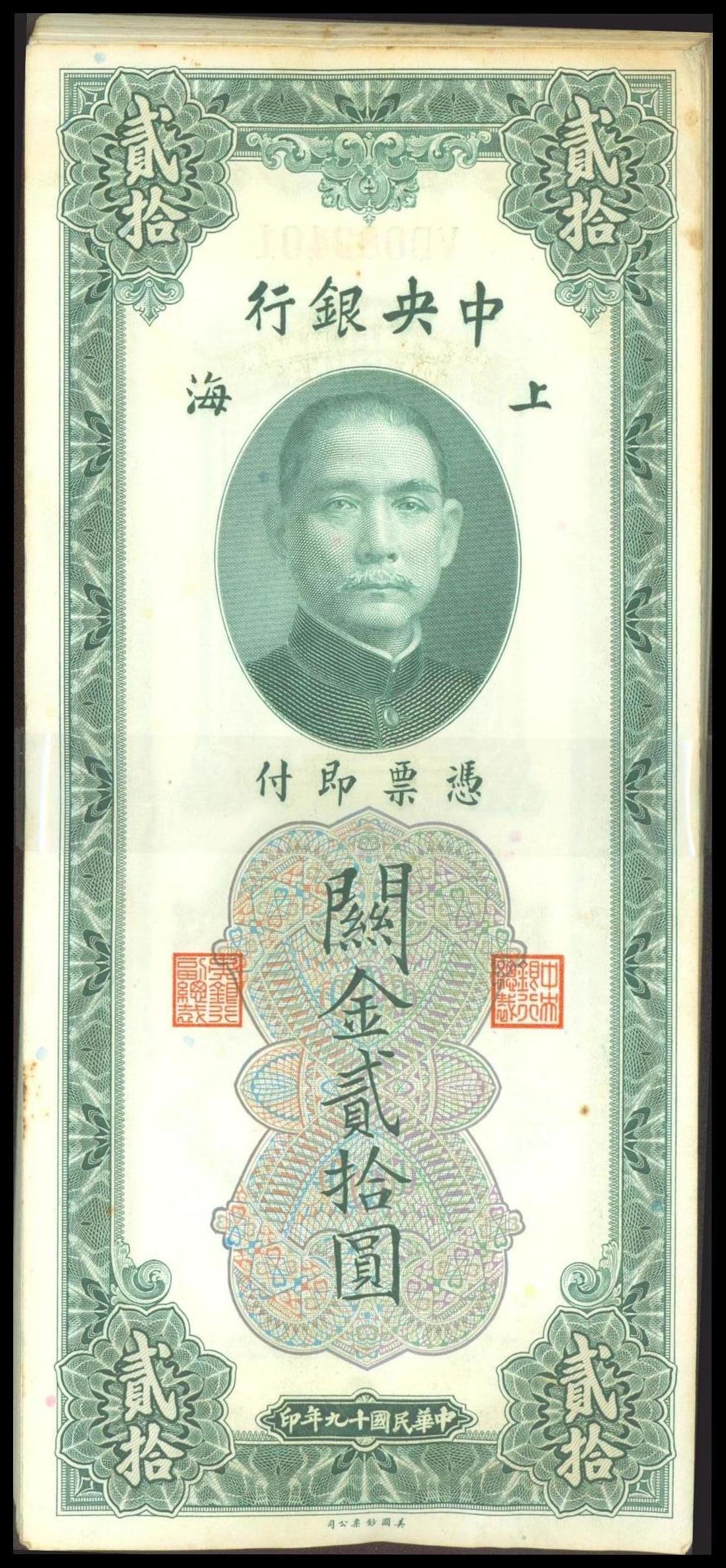 Central Bank of China, 20 CGU, 1930, consecutive run of 100, serial number VD082401 to VD082500, dark-green and multicolour guilloche, Sun Yat Sen at top, reverse green, building at top centre,