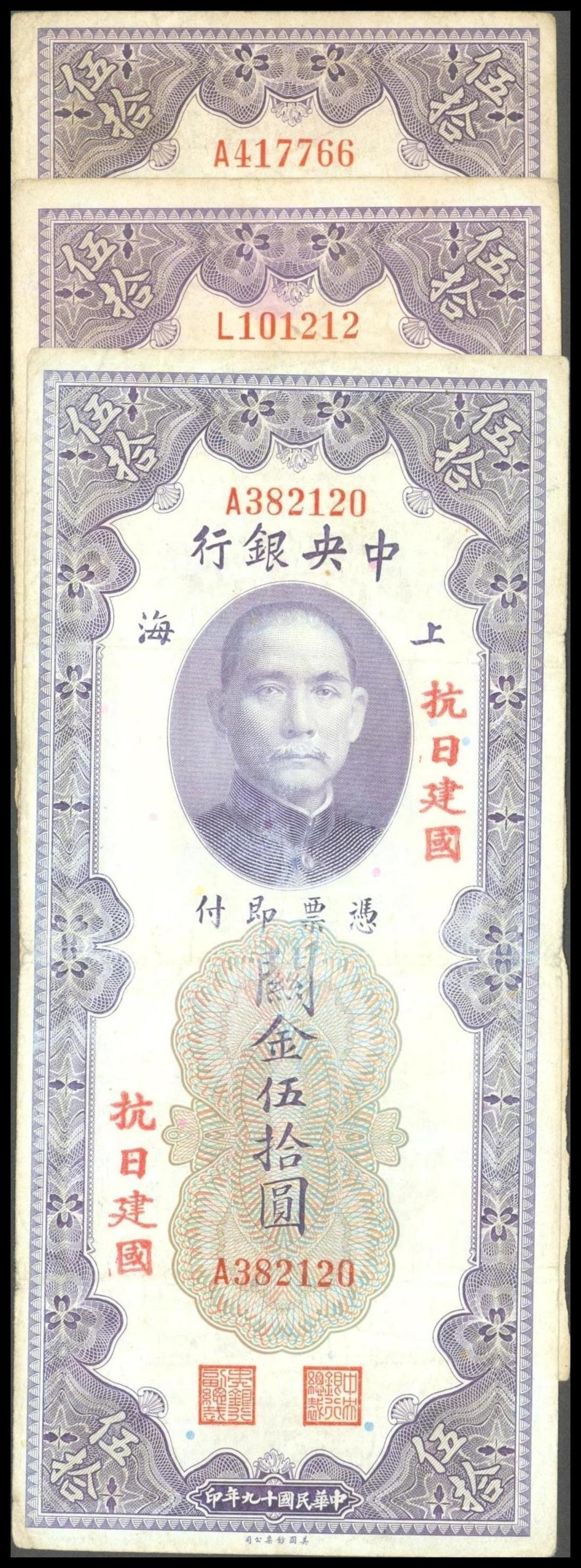 Centre Bank of China, a lot 3 x 50 CGU, 1930, Shanghai, vertical format, purple with multicolour guilloche, Sun Yat sen at top centre, overprinted with red Chinese characters, reverse purple, building at top centre,