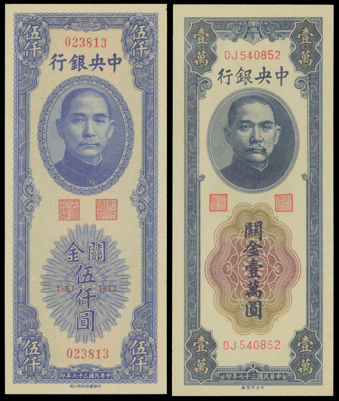 Central Bank of China, 5000 and 10000 CGU, 1948, serial number 023813, DJ540852, blue and blue with multicolour vignetten respectively, Sun Yat Sen at top centre,