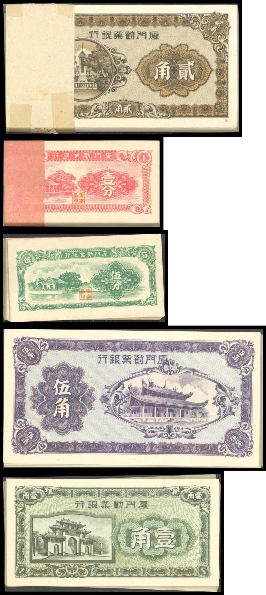Amoy Industrial Bank, 1 fen, 5 fen, 10 cents, 20 cents and 50 cents, all consecutive run of 100, ND, 1 fen and 5 fen no serial number, others serial number on reverse,