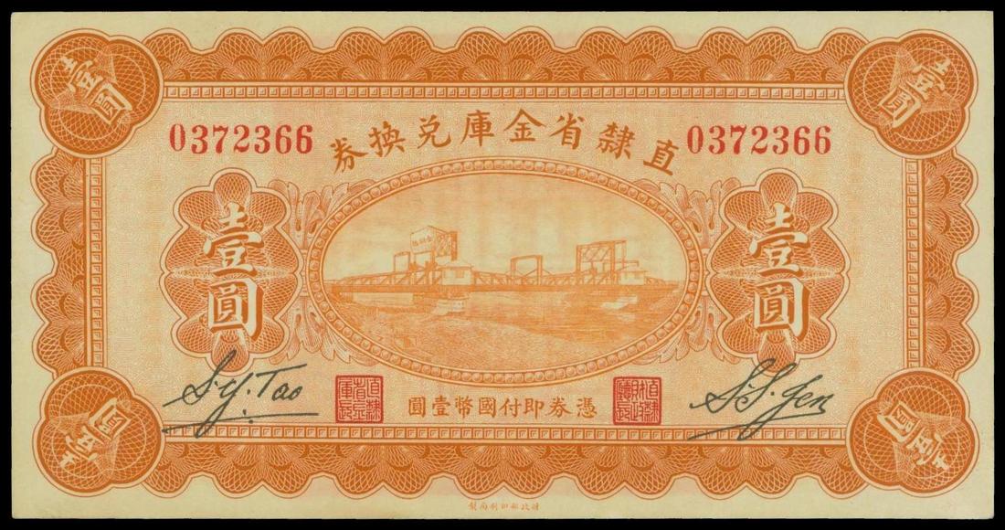Chihli Province, Treasury Exchange Note, 1 yuan, 1928, serial number 0372366, orange, bridge at centre, reverse orange, large red chop,