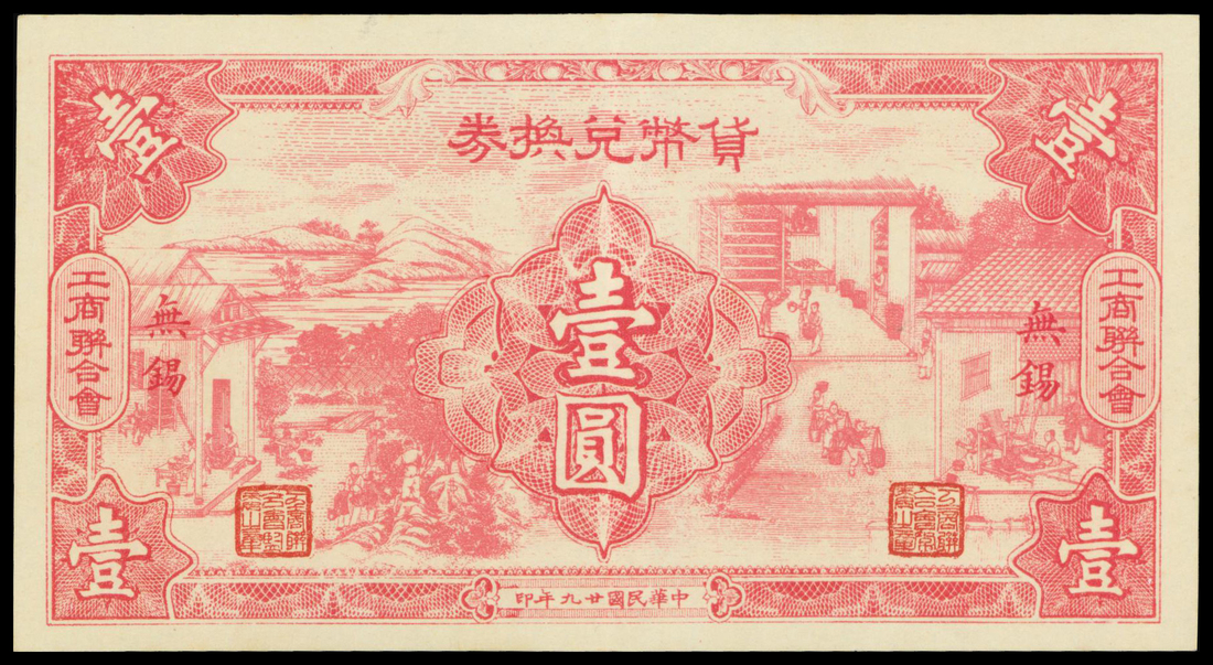 Silk Factory Corporative Society, Wuxi, 1 dollar, 1940, red, value at centre, scene of sericulture left and right, reverse red, factory at centre, extremely fine to about uncirculated.