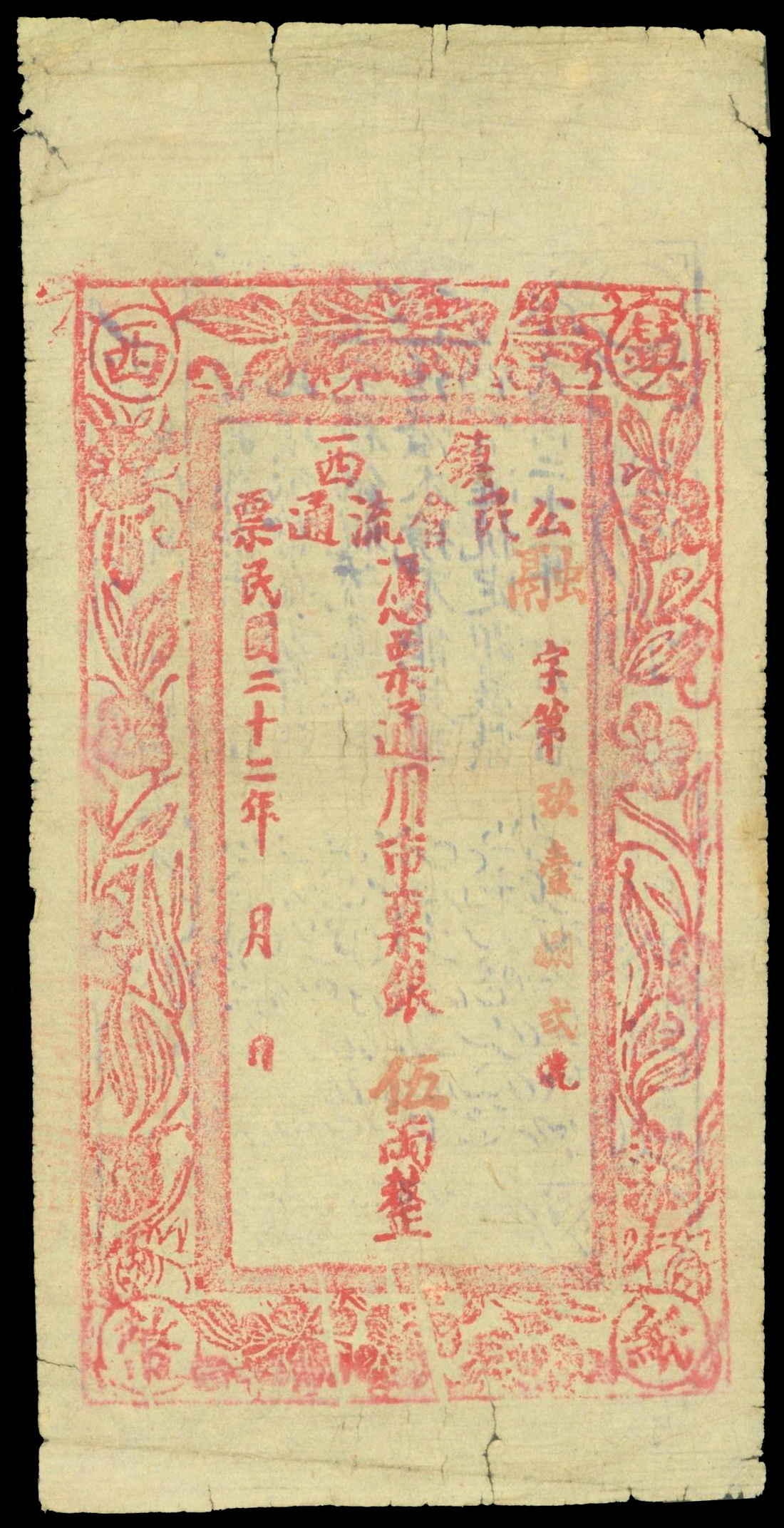 Zhen Xi Civilians Society Issue, circulating note, 5 taels, 1933, serial number 9182, vertical format, woodblock print, red, border with flowers and four Chinese characters at four corners, reverse blue, Chinese text and flowers border, red stamp at low right,